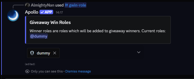 a!winsThis command shows the amount of win counts of giveaways hosted in the particular server and in all the servers apollo is in. In addition to the count, this command also shows what prize has been won by that particular user.