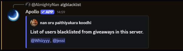 a!gblacklistThis command blacklists a particular user from reacting/participating in giveaways by automatically removing reactions to giveaways in the particular server. This command only applies to the local server and not the global giveaway blacklist (i.e. the user can still participate in other giveaways hosted by apollo in other servers) Just type in