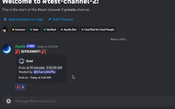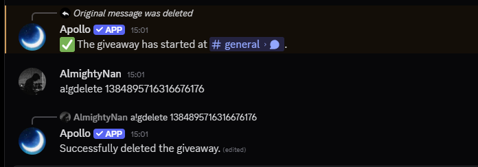 a!gstart <time> <winners> <prize>. Once you have entered the parameters, Apollo will automatically delete your message and start a giveaway in that particular channel. For Example to host a giveaway with 2 winners, time of 1 hour and prize of Gold, we type ina!gstart 1h 2 Gold