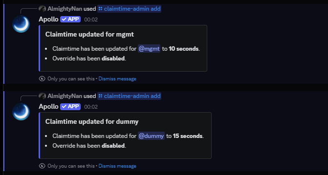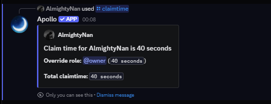 In this case I have three roles including the roles as shown in the previous screenshot(s), but Apollo only calculates for my role which has its override setting enabled. Hence, override allows you to bypass all other claimtime(s) which you may have.